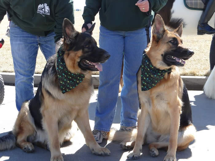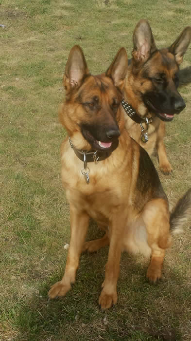 This is "Roxy" (orange collar) a female pup from Ben x Bella's November 2013 litter. Roxy now resides in Arizona.