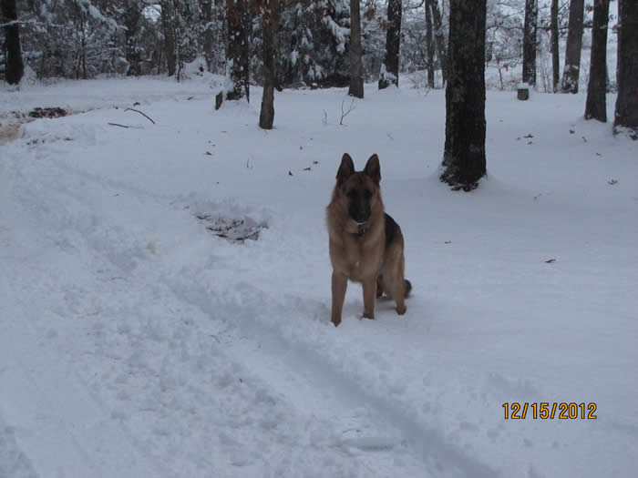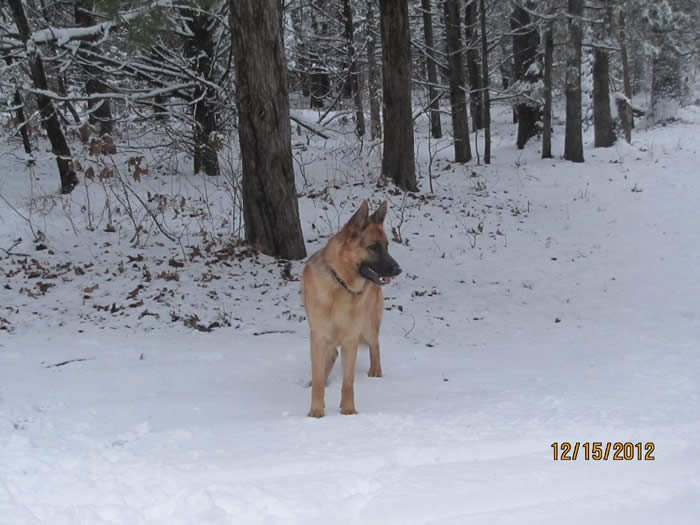 Just wanted to send you a few pictures of Ace. He is getting big. He looks a lot like his mother. He is very protective of everybody in the family. We all know he is a big baby though. He really is a good dog. He minds very well. He hates the thought of us being mad at him. That is all it takes for discipline. Everything is a game to him. I hope he doesn't lose that when he gets older. He loves the snow and cold. He stays inside with us. I am amazed at how the cold doesn't effect him. He is really good with our Shitzu. We live in the country there are a lot of Coyotes. We worry about Skittles (The Shitzu) being outside without us. If she is ever outside and we don't know where she is, we just tell Ace to go find Skittles. He will run and find her and stay with her until she comes in.