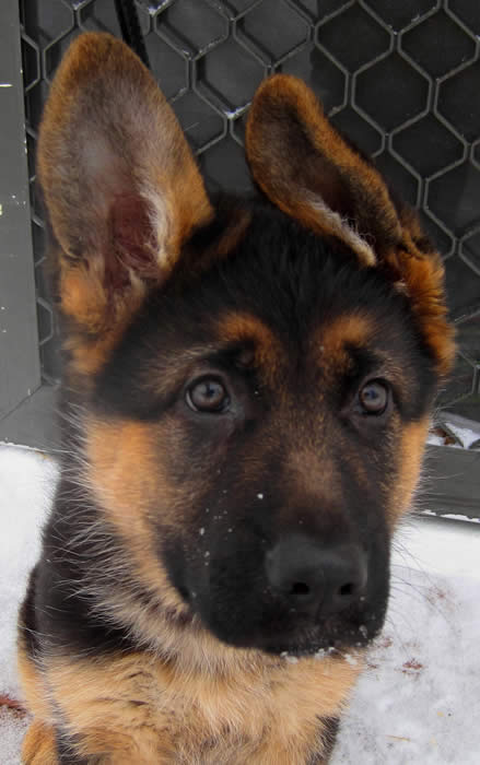 Our beautiful girl, Ava, a gorgeous deep red and black German Shepherd pup from imported Champion parents, Ben x Bella's November 2013 litter. Photo taken 02/02/14 @ 11 wks of age. Ava is BIG girl of 29 pounds!!! She has a big head like her dad, Ben. Beautiful expression, outgoing, playful, confident, focused, extremely intelligent! Big blocky head! Substantial boned female. We adore her!