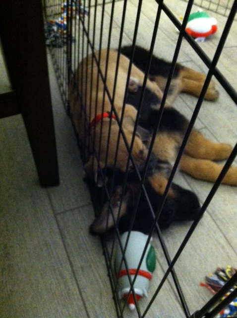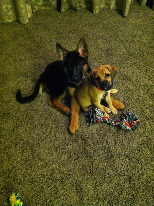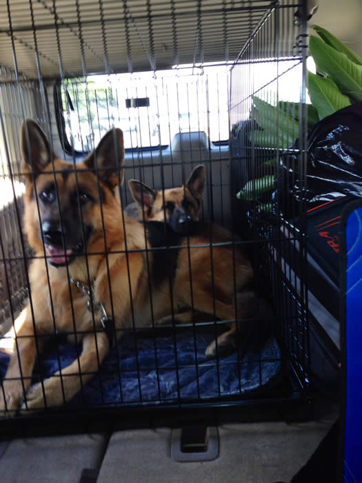 This is Roxy a pup from Ben x Bella's 11/13/13 litter and her "brother" right after she was shipped to Paula in AZ. (BEFORE)