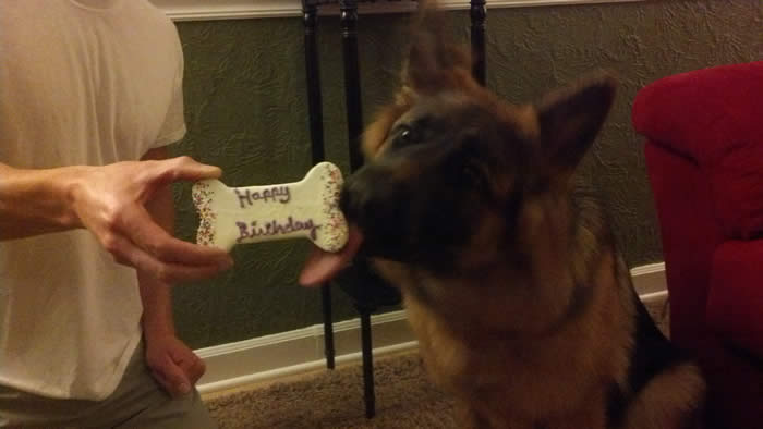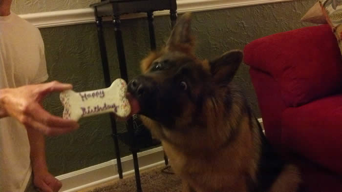 This is "Emery" a female pup from Ben x Bella's 11/13/13 litter she is celebrating her first birthday. Emery resides in IL.