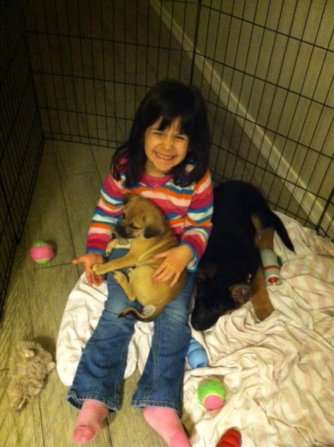 Here is Toby (Puggle) & Roxy with my baby girl who seems to be the puppy whisperer.