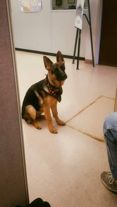 Dakota is the "official" Director of Security and employee morale where Debbie works in St. Louis. Dakota is a pup from Ava x Ruger.