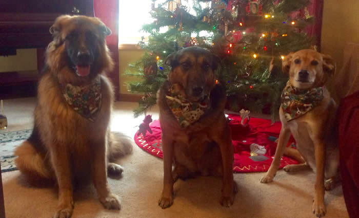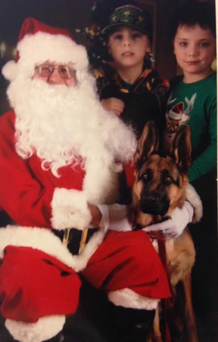 This is Santa and "Dakota" aka orange collar male from Ava x Ruger's April 2016 litter. Dakota's buddies Nathan & Logan are in the back. They love Dakota and Dakota LOVES them. Dakota resides in Quincy, IL with Ron & Nancy.