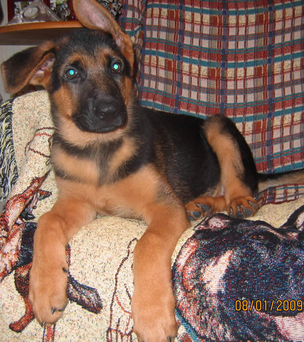 7/11/09 @ 8 wks old. Exceptional puppy! Current on all vaccinations/de-worming. Sold with vet health certificate. He is ready to go to his new loving forever home now. BIG~~GORGEOUS~~Black and VERY RED male~Outstanding temperament! SOLD