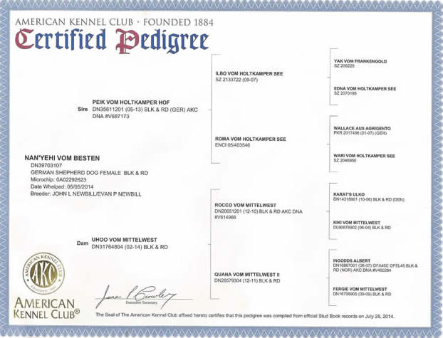Nan'Yehi vom Besten (Red) pedigree. Red's dad is World Sieger/Champion VA Peik vom Holtkamper Hof SchH3 and Red's mother is Uhoo vom Mittelwest SchH2/IPO2.