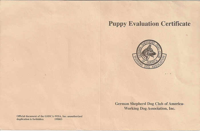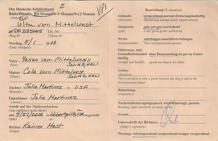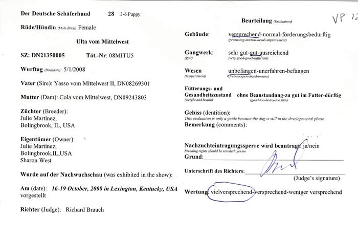 This is Ulta's VP rating at "The 12th North American Sieger Show" 2008. Judge Richard Brauch.
